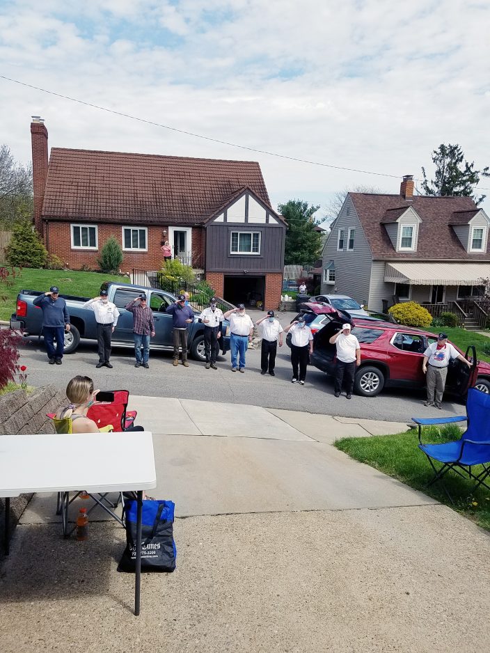 The town’s volunteer fire department sent trucks to drive by in a salute to former U.S. Army airman Carl Walpusk, who lives in Moon Township, but is staying with family members in the Washington County borough while he recuperates from a recent hospitalization.