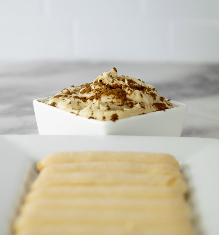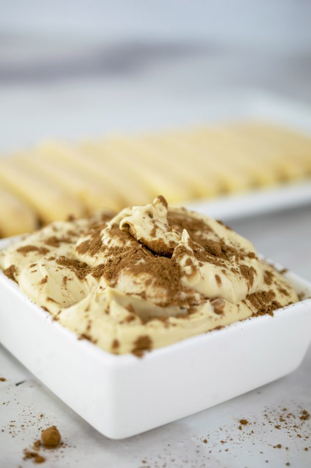 Serve with ladyfingers or fruit to bring that sweetness to a whole new level, and it’s topped with a final sprinkle of cocoa powder to give it that extra appeal. You do eat with your eyes first after all.