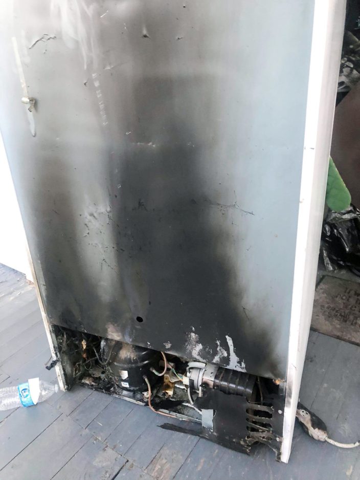 He left, but returned a few minutes later to a house full of smoke – the refrigerator and the wall behind it were on fire.