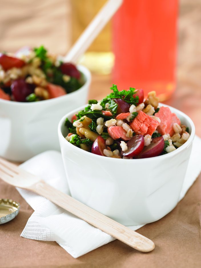 Tenderize kale by blanching in boiling water 2-3 seconds or microwaving 1 minute. Rinse pieces in cold water to stop cooking; squeeze dry. Fluff and uncrimp dry kale pieces with fingers. In medium bowl, mix barley, kale, grapes, salmon and walnuts.