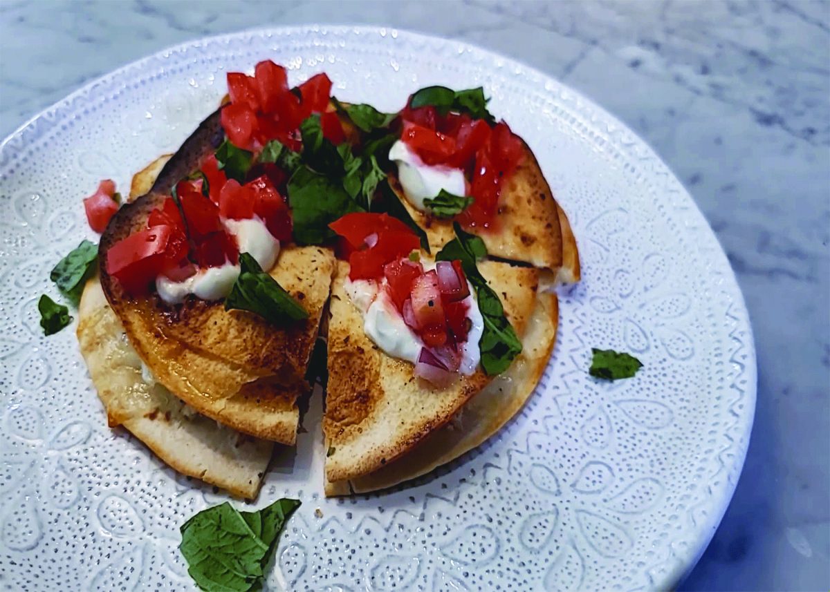 Cut each quesadilla into four pieces. Garnish each slice with dollop of sour cream. Add dollop of tomato salsa on top of sour cream and garnish with basil.