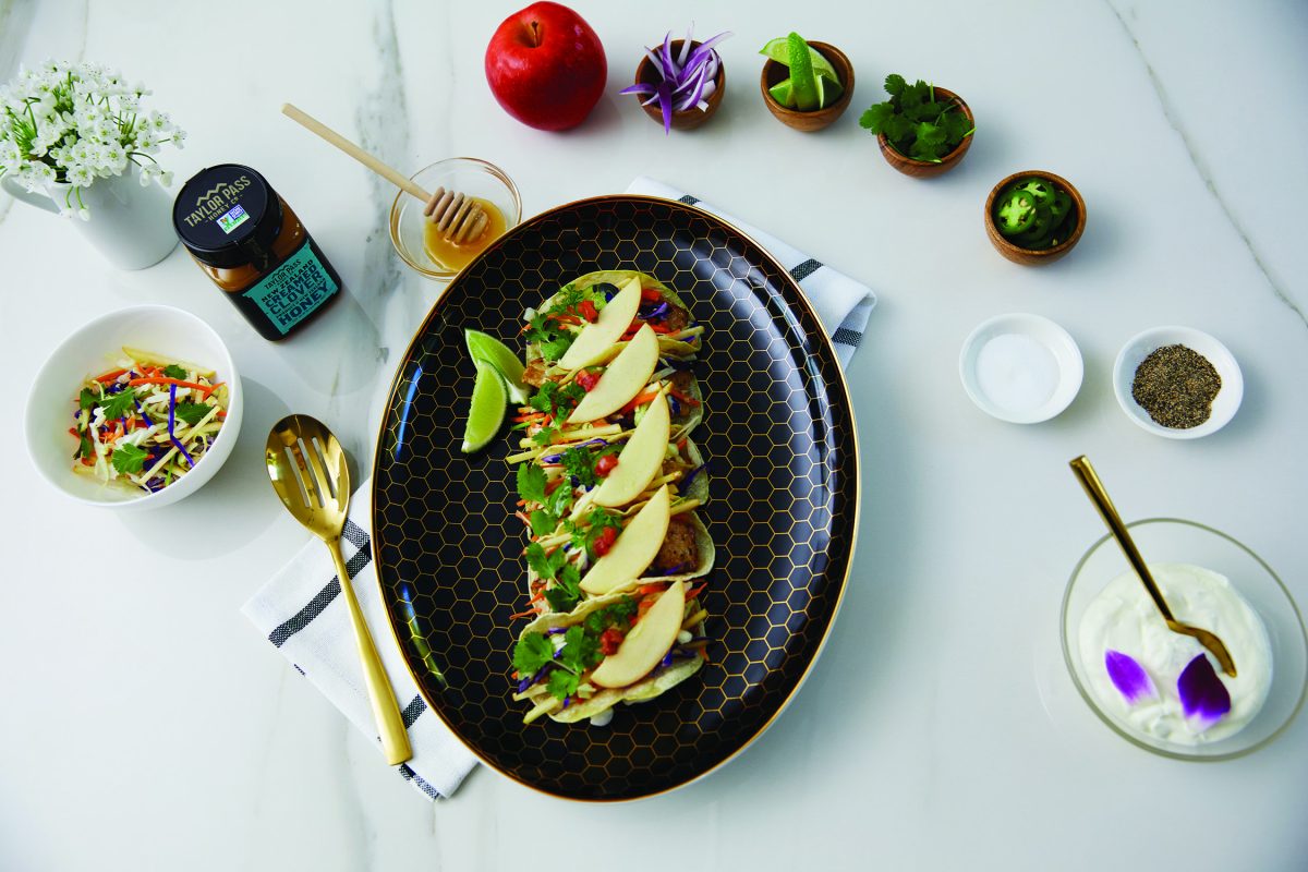 Top taco shells with pork, slaw, sour cream and squeeze of lime juice. Top with apple wedges.
