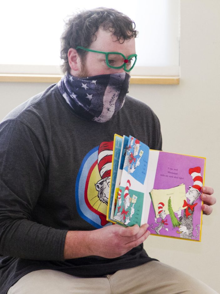 Josh Werner wears his homemade glasses while reading “I Can Read With My Eyes Shut!” to the program participants.