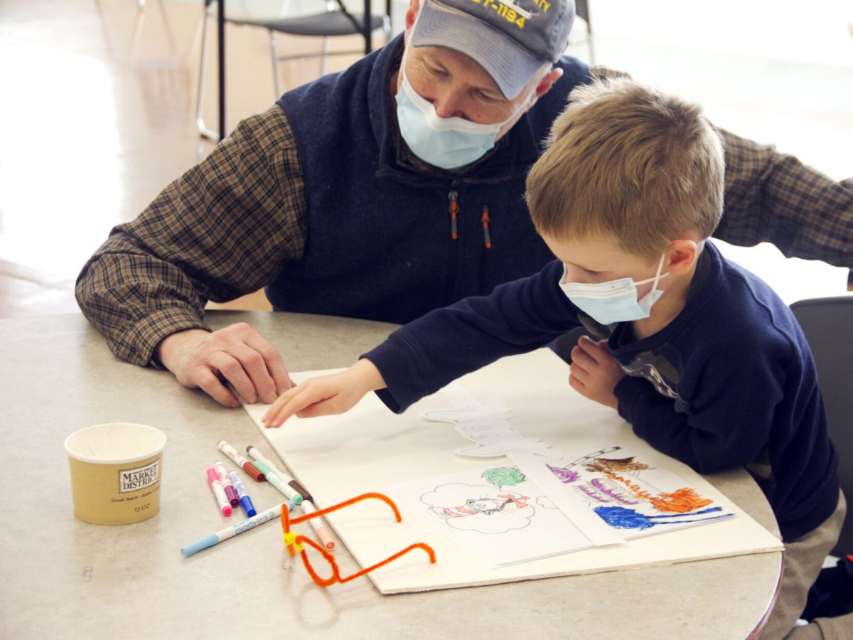 Young Beau Trueblood reaches for a marker, while Michael Trueblood is ready to offer assistance if needed.
