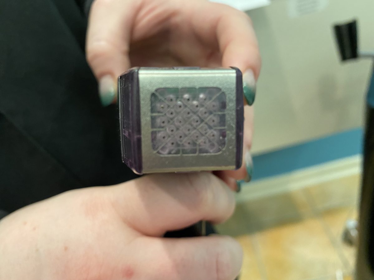 With microneedling, a topical numbing medication is applied to the skin for 20 minutes before the procedure. Patients feel the device on their skin and a vibration, with many patients comparing the feeling to having an electric toothbrush run over their skin. The device looks like a jumbo pen with a disposable cartridge containing the needles.