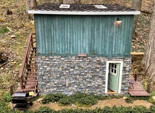 Upstairs includes a living area with a couch and chairs. A refrigerator and sink also can be found in a portion of the living area. Of course, the refrigerator – a facsimile of her own refrigerator – is adorned with a miniature Steelers’ magnet. There is a bathroom complete with sink, shower and toilet. The project even includes wiring to light the lamps.
