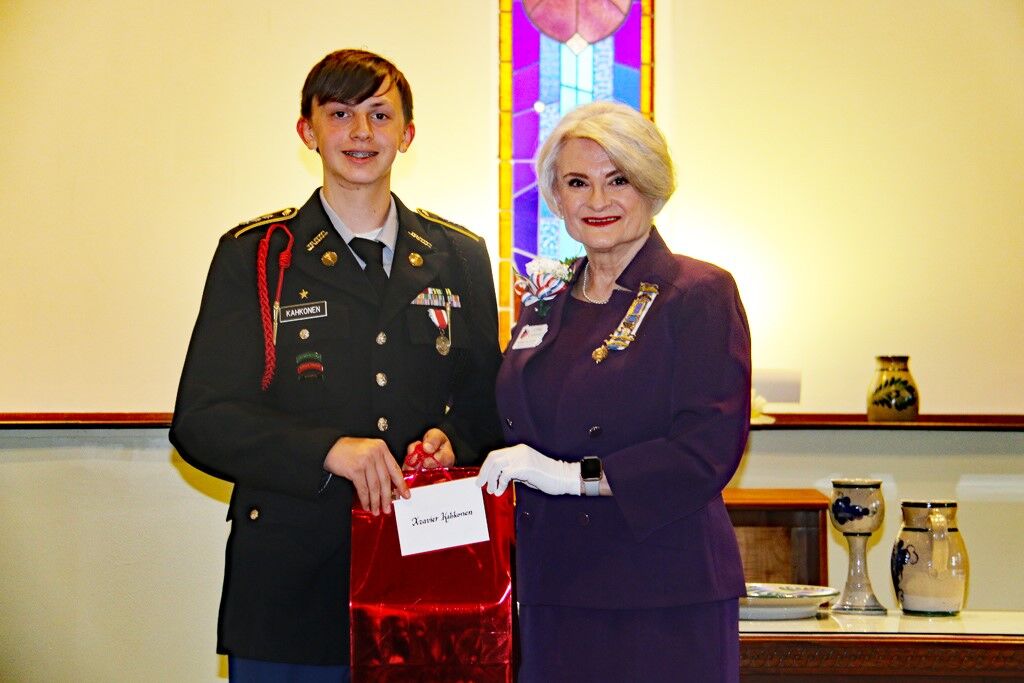 A Military Ball was held May 4 at Trinity High School for the JROTC students, where a bronze JROTC medal and certificate were awarded to Trinity High School Cadet Xzavier Kahkonen. Kahkonen received an additional gift from the chapter at the ceremony, thanking him for his service to the country.