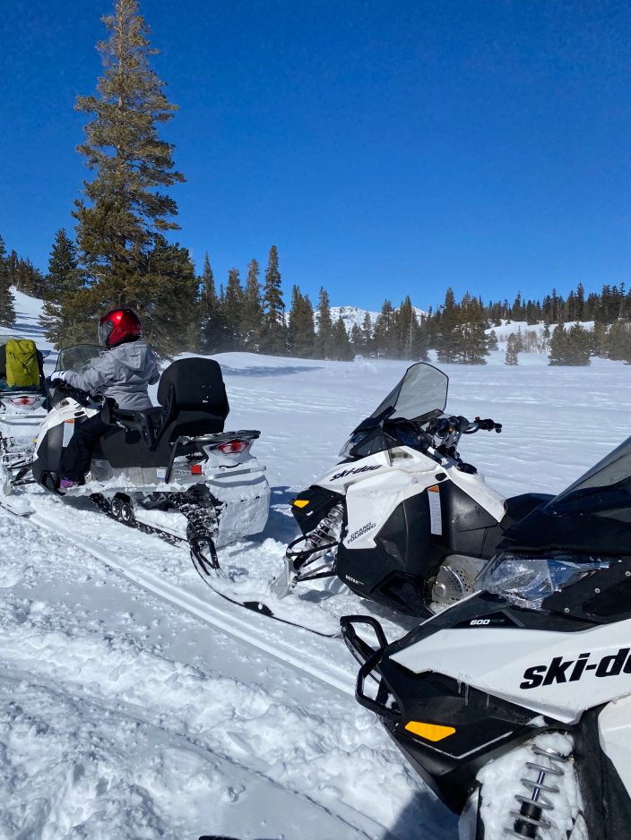 Speaking of snowmobiles, we signed up for one of the many tours you can take either driving your own sled or riding in pairs. Lake Tahoe Adventures picked us up for their summit snowmobile tour in gorgeous Hope Valley south of Lake Tahoe. We began at an elevation of 7,200 feet and climbed the winding trail looking west across Faith Valley with views of the 10,000-foot Sierra Crest under brilliant blue skies and sunshine.