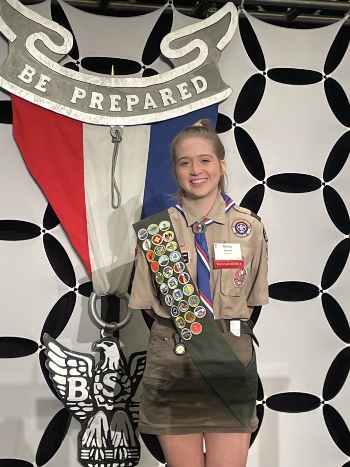 To attain the rank of Eagle Scout, Walsh needed a minimum of 21 merit badges (she earned 32), demonstrate Scout Spirit and leadership within the troop and complete a service project.