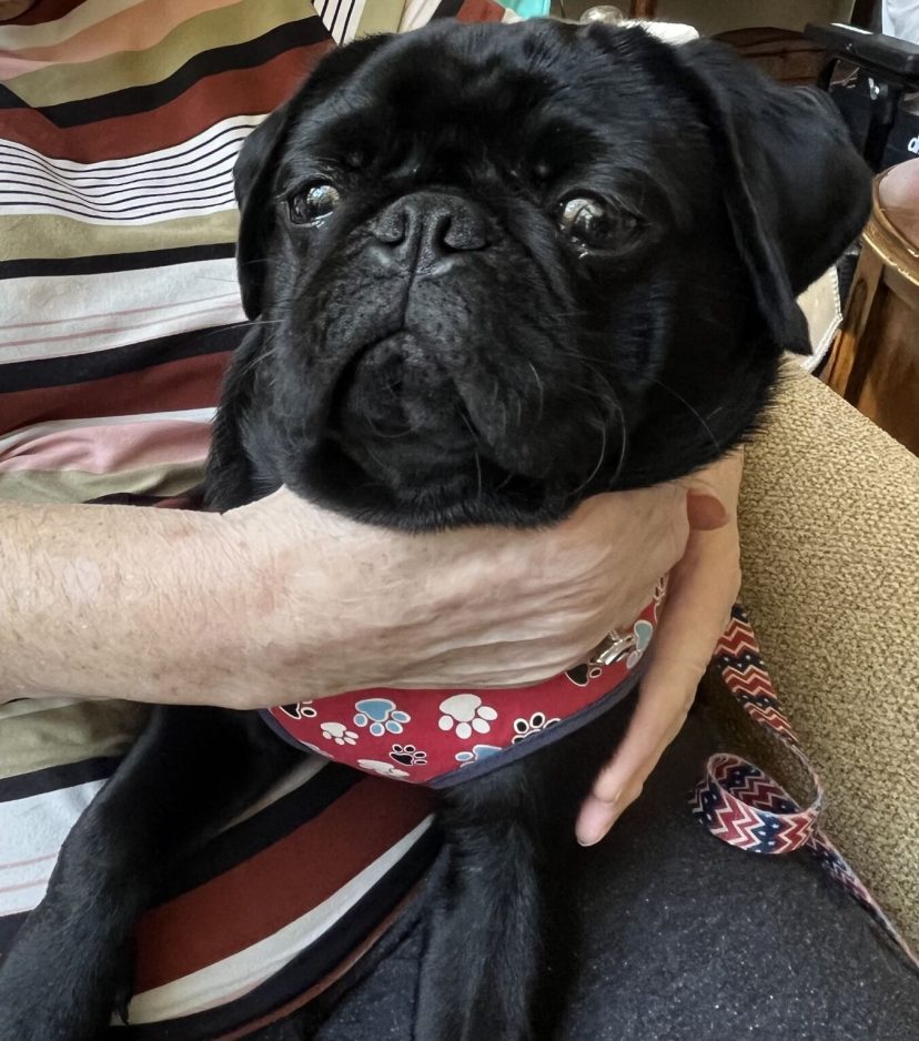 That would be Sir Walter, the “Paramount Pug.” The 7-month-old pup belongs to Sarah Ward, the facility’s activities director. Ward began bringing Walter around earlier this year, much to the delight of residents.