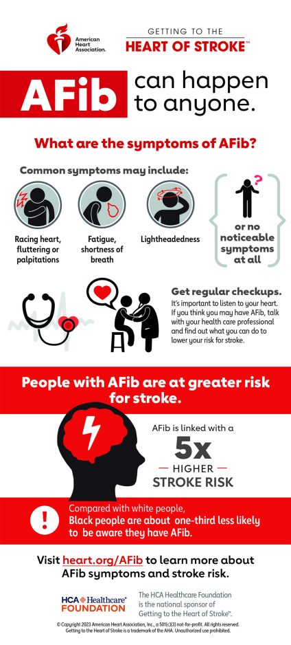 “Early identification and treatment of AFib is critical to stroke prevention, especially in high-risk populations experiencing health care disparities or barriers to accessing vital health care resources,” said Steven Manoukian, M.D., FAHA, senior vice president at HCA Healthcare. “Common risk factors, like high blood pressure, are more prevalent within Black communities, yet Black patients may be diagnosed less often with AFib. Creating awareness of AFib, stroke risk and treatment options can be a lifesaving first step in stroke prevention.”