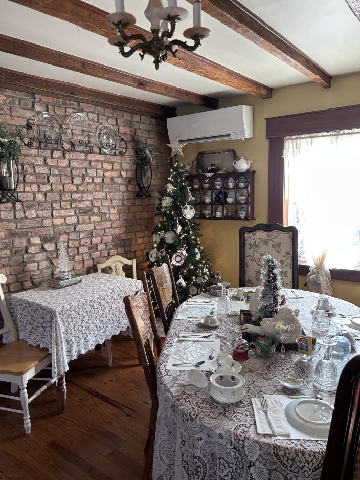 The building was constructed in the 1820s and is a registered historic landmark. McGinnis said the brick building has been “lots of things” over the years, including the Moses Tavern in the 1820s. She has decorated the rooms in keeping with that era along with some Victorian touches.