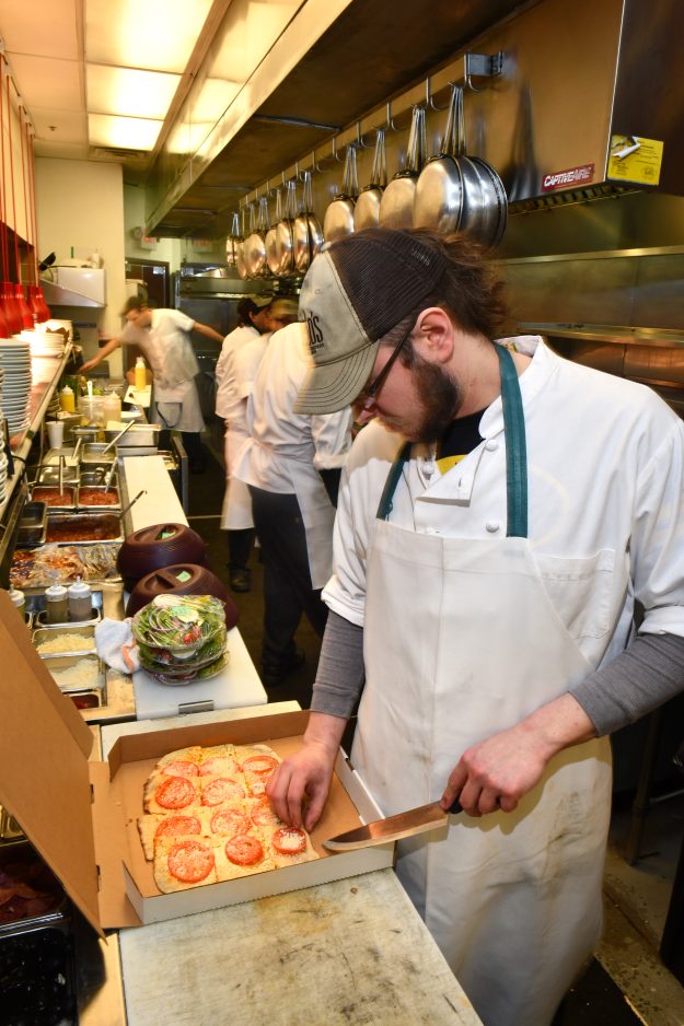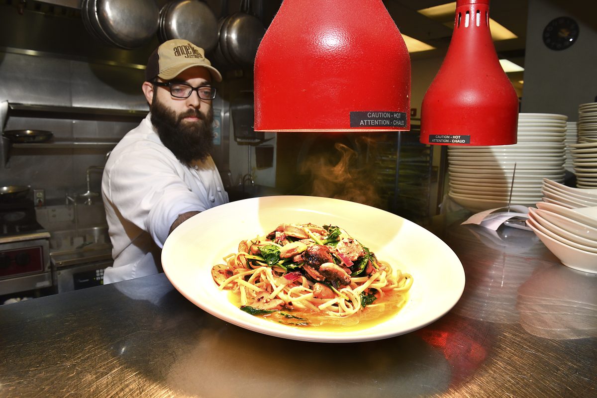 Chef Kolt Eadie holds a fresh dish of linguini arrabbiata – hot sausage, red onions, mushrooms, spinach and romano cheese tossed with red pepper flakes in an oil and garlic sauce. Caution: It’s spicy hot.