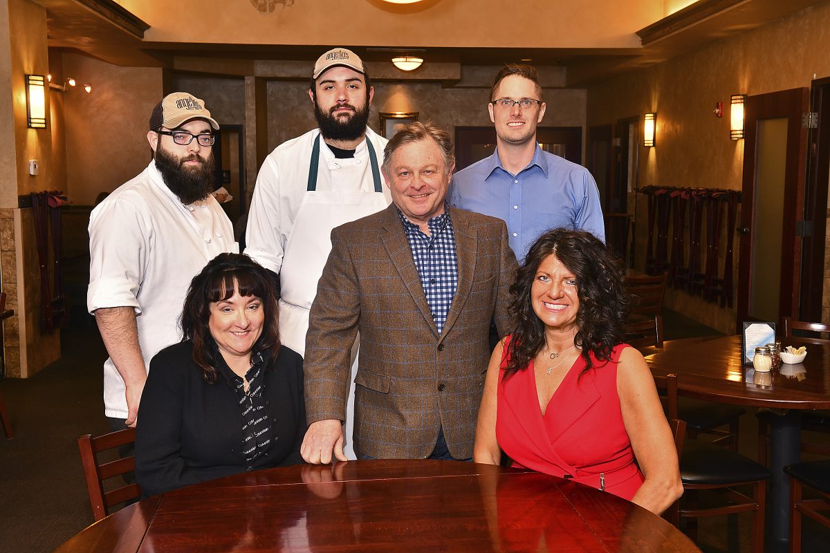 The Angelo’s management team, clockwise from top left: Chef Kolt Eadie, Chef William Hart, floor manager Mike Vlainich, manager Dawn Calabro, owner Michael Passalacqua and administrative assistant/accountant Rhonda Shough