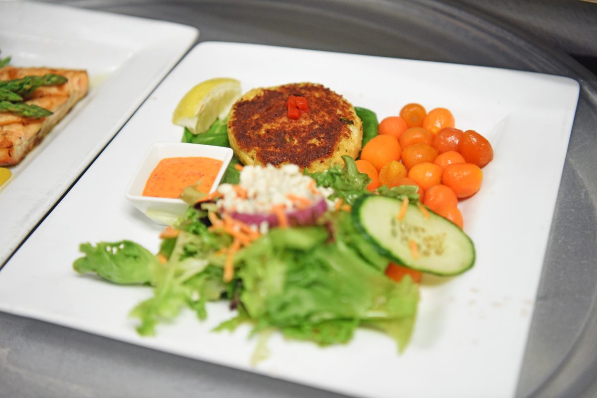 A crab cake “one plate” features creole tartar sauce and is plated with the vegetable du jour and a mixed-greens salad with house white balsamic vinaigrette.