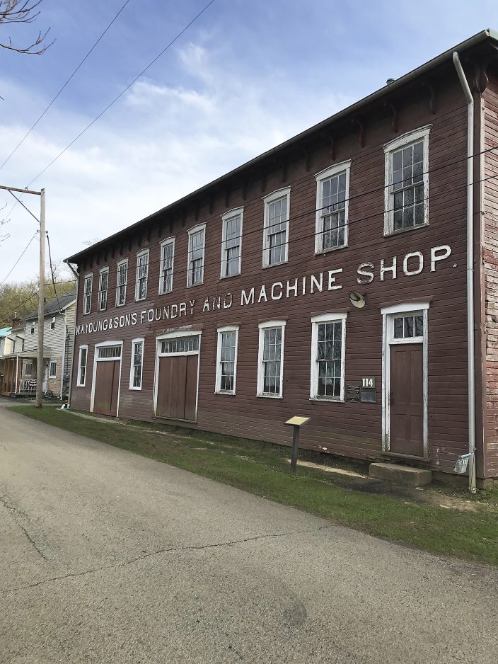 The centerpiece of Rices Landing was – and remains – the W.A. Young and Sons Foundry and Machine Shop. Founded in 1900, it stayed in business until 1965, and is considered to be an important exemplar of industry from the early 20th century. William A. Young, the foundry and machine shop’s operator and owner, built it using lumber from his farm, and it initially repaired steamboats. Later on, it provided automobile repairs and added a hardware store.