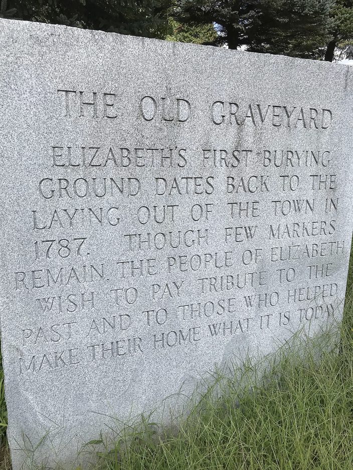 A marker notes the location of Elizabeth’s first graveyard, which contains the remains of Elizabeth Mackay Bayard, for whom Elizabeth was named. Her grave is now unmarked.