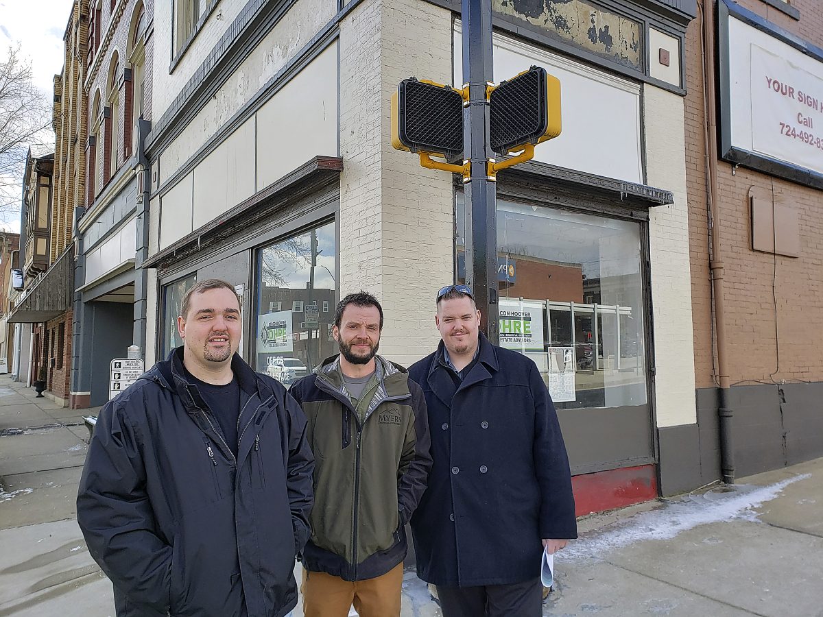 Business partners Josh Myers, Justin Tonecha and Ian Hoover are shown outside of the historic building they flipped at Third and West Main streets in Monongahela.