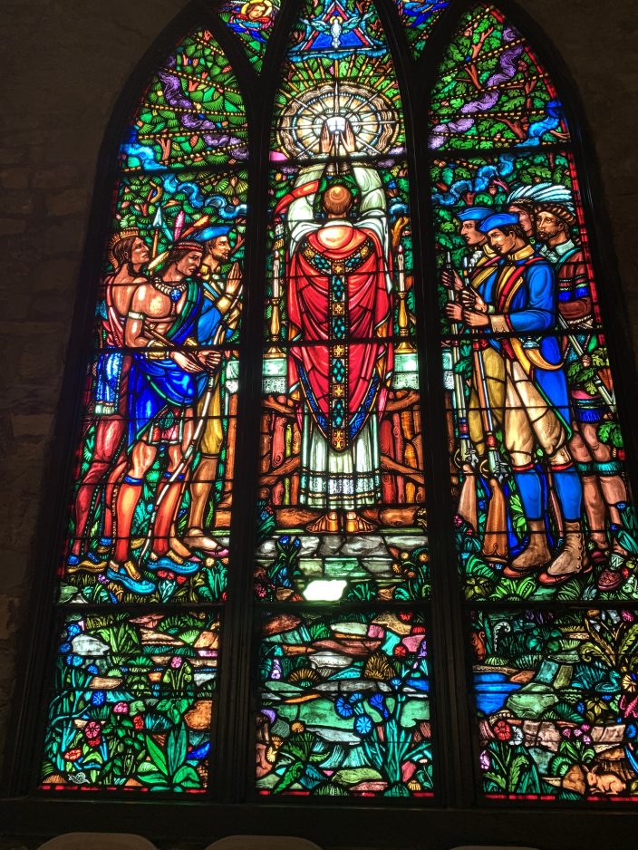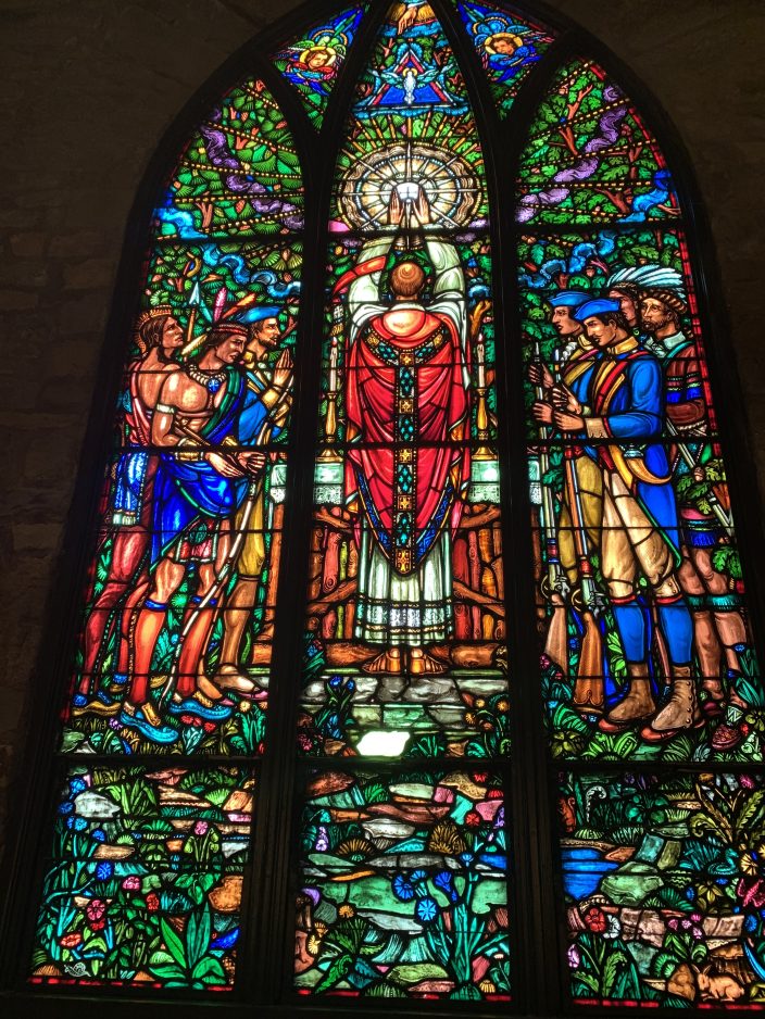 French troops on their way to capture Fort Necessity from the British disembarked from the Monongahela River at the mouth of Red Stone Creek – below the site of the present St. Peter’s Church, where their chaplain prayed for victory. The Mass is commemorated in one of the stained glass windows in the church.