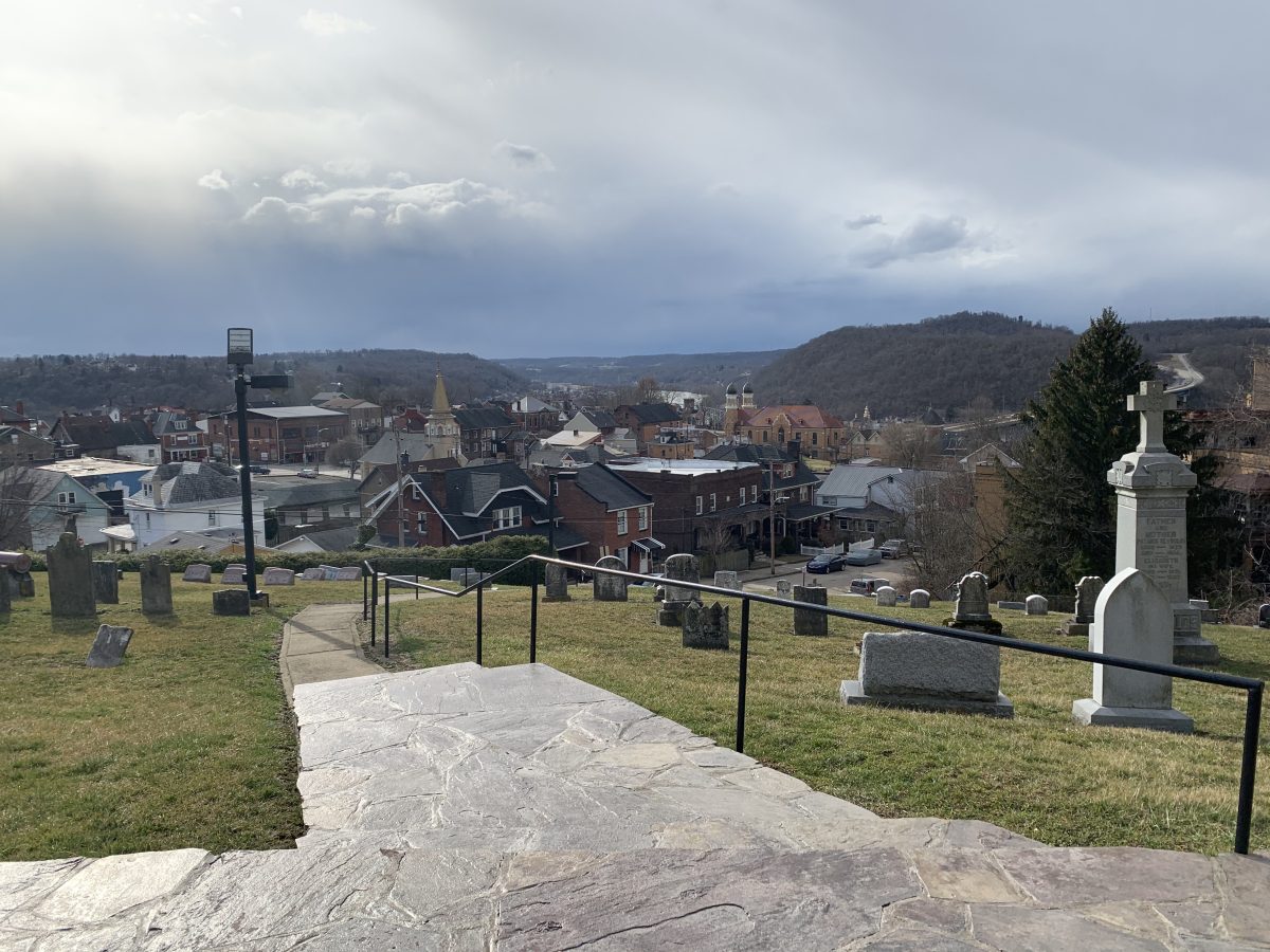Perched atop a hill on the east bank of the Monongahela River, the church’s exterior features a distinctive Gothic spire. It is surrounded by a cemetery that includes graves of Revolutionary and Civil War soldiers.