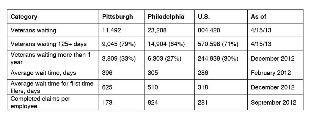 Though the Philadelphia office performs better than the Pittsburgh office on many measures, it is not without problems. The VA’s Inspector General recently sampled 60 disability claims from the Philadelphia office and discovered errors that resulted in four veterans receiving an extra $194,130 in payments. Also, some Iraq War veterans were not notified that they were entitled to treatment for mental disorders.