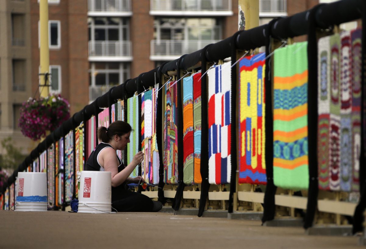 Volunteers worked all weekend to attach 580 blanket-size, hand-knitted panels to the pedestrian walkways on the downtown bridge, and riggers attached larger panels to the towers.