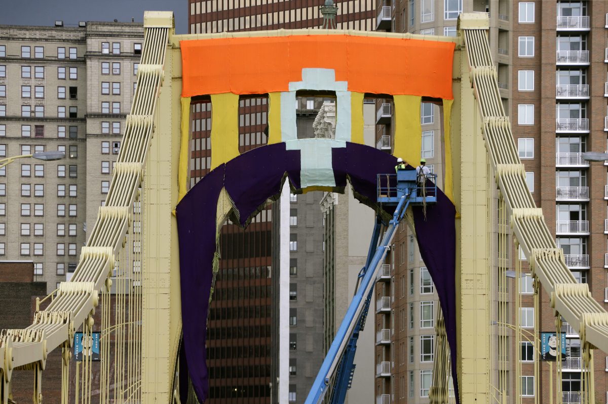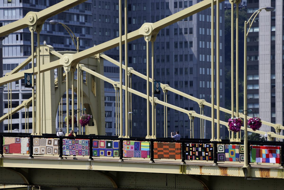 PITTSBURGH – More than 1,800 knitters have covered Pittsburgh’s Andy Warhol Bridge in 3,000 feet of colorful yarn.