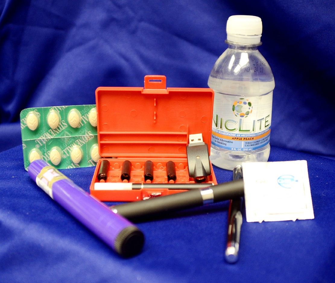 The American Lung Association reports that alternative tobacco products, such as the candy-flavored cigars (purple tube) and dissolvable tobacco lozenges (green packaging) pictured, have surged in popularity thanks in part to their cheaper prices. The state does not currently have an excise tax on tobacco products other than cigarettes. Also pictured are a pair of pen-shaped e-cigarettes and an e-hookah with a USB charger, as well as hand gel and water that contain nicotine.