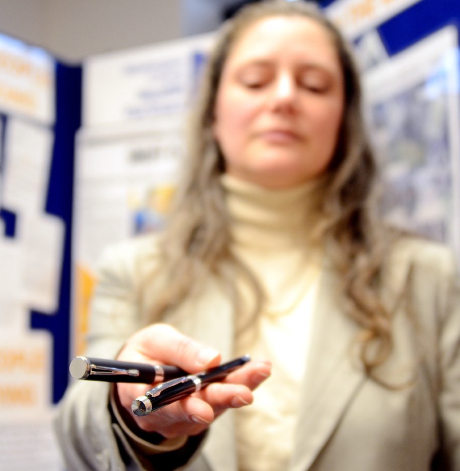 Lee Rutledge-Falcione, executive director of Washington County Health Partners, holds two pen-shaped e-cigarettes.