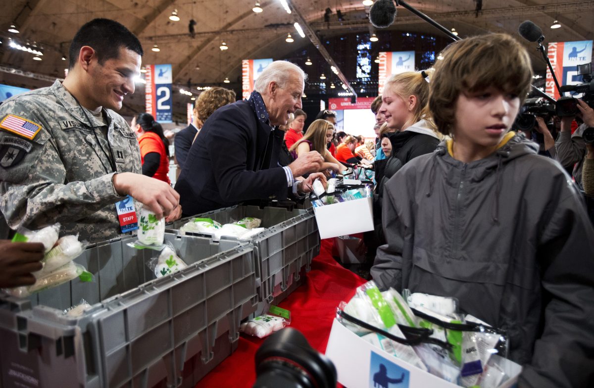Biden and his wife, Jill, spent time at an armory pitching in as volunteers packed 100,000 care kits for deployed members of the military, wounded warriors, veterans and first responders.