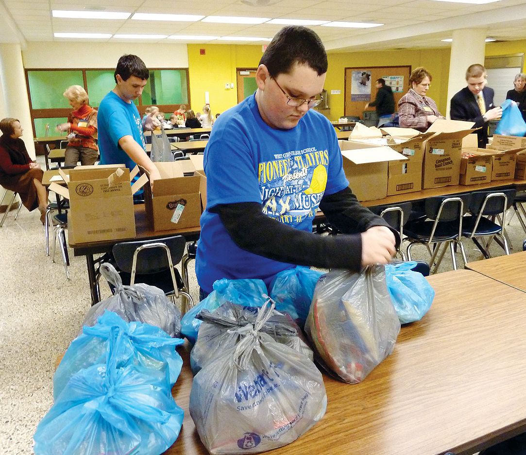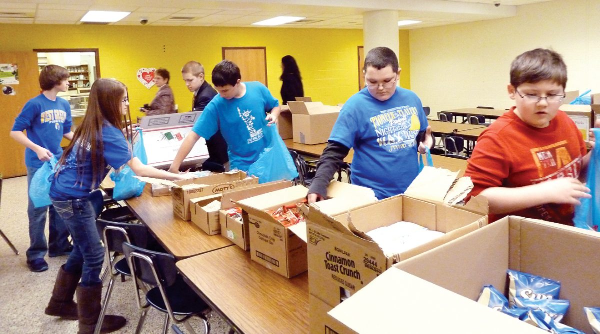 In about 15 minutes, these middle and high school students who report to the cafeteria promptly at 12:45 p. m. will pack 54 bags that will be placed in six cardboard boxes – two marked for Graysville Elementary, two marked for Springhill-Freeport Elementary, and two marked for the middle school.