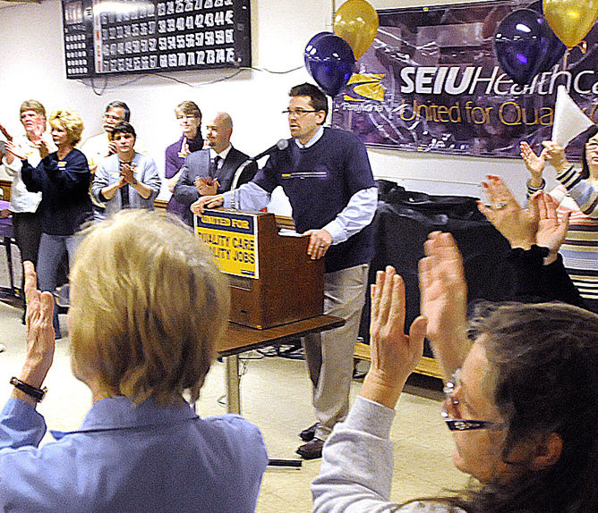 The union, representing 400-plus service workers at the hospital – about one-fourth of the 1,700 employed there – had a spirited rally Wednesday afternoon in the banquet room at Alpine Lanes in Washington. An audience of about 120 SEIU members and supporters heard and cheered the speakers, including state Rep. Jesse White, D-Cecil Township, and Zobrist.