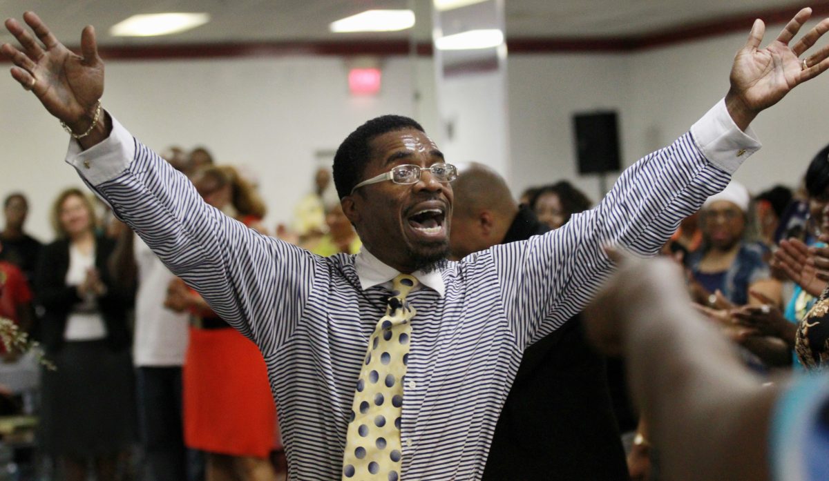 “He is your father!” shouts the Rev. Roscoe Heath from a pulpit in a former Lane Bryant store, now the home of New Praise Ministries. “You are a servant!”