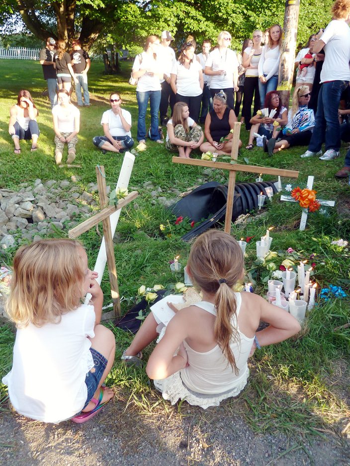 More than a hundred people gathered Tuesday evening to celebrate the lives and mourn the loss of Joseph Michael Bowland and Michael Dillon Gregg. Wooden crosses, candles and flowers marked the otherwise unremarkable grassy patch along Joffre Bulger Road in Smith Township where Bowland, 20, of McDonald, and Gregg, 22, of Bulger, died when their vehicle crashed Saturday.