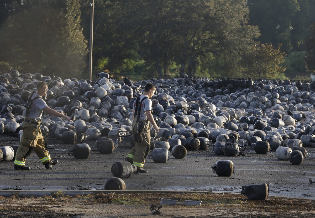 Smoke still billowed Tuesday morning from a storage container on the property, which consists of a couple of warehouses next to each other. The parking lot was littered with thousands of blackened 20-pound propane containers.