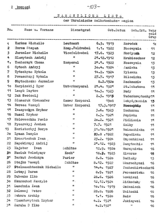 An SS payroll document, dated Oct. 12, 1944, says 10 members of the Self Defense Legion “fell while deployed to Warsaw” and more than 30 others were injured. Karkoc is listed as the highest-ranking commander of 2 Company – a lieutenant – on a pay sheet that also lists Dak as one of his officers.