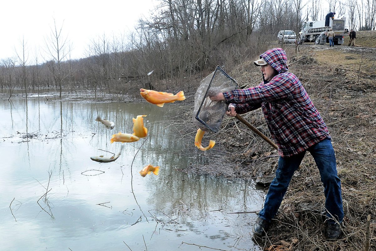 Volunteers braved freezing temperatures to release the rainbow trout from the tanks of the stocking truck into the roughly five feet of water now standing at the bottom of the lake.