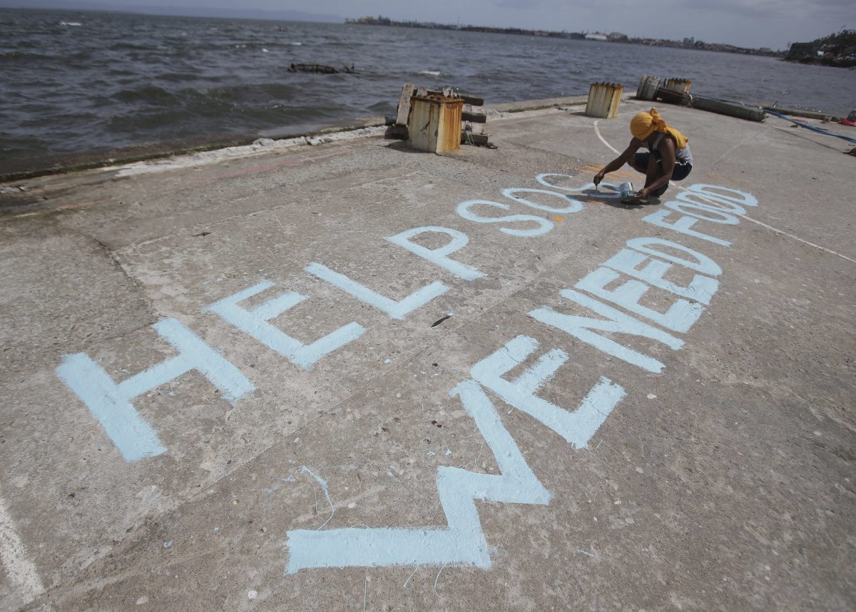 “Help. SOS. We need food,” read a message painted by a survivor in large letters on the ravaged city’s port, where water lapped at the edge.