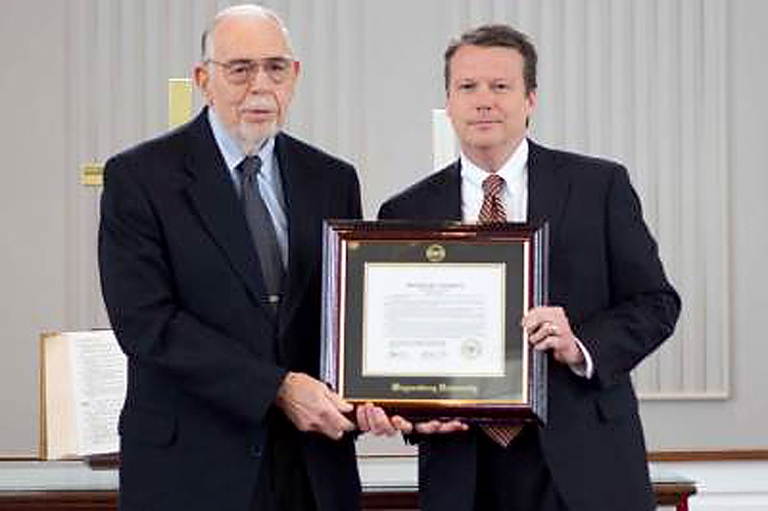 On behalf of the university, President Douglas G. Lee conferred upon Dr. Robert LaCount, professor of chemistry, the title of professor emeritus. LaCount retired from his full-time position in August 2013. He joined Waynesburg College in 1965, and during his 49 years of service, he eagerly incorporated the education of students into his groundbreaking research.