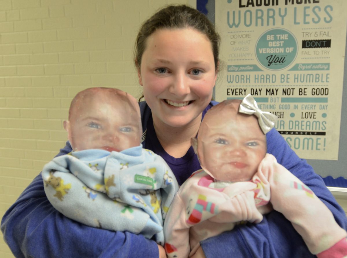 The week began with a gender “reveal,” with each student picking a blue or pink pin from a container to determine the baby’s gender. Students were required to take the babies everywhere they went and keep an hourly log of where their children were. Students had to have the babies on their desks or in a designated day care area. Antis and Hewitt also brought in life-size baby dolls for other activities like feeding and changing diapers.