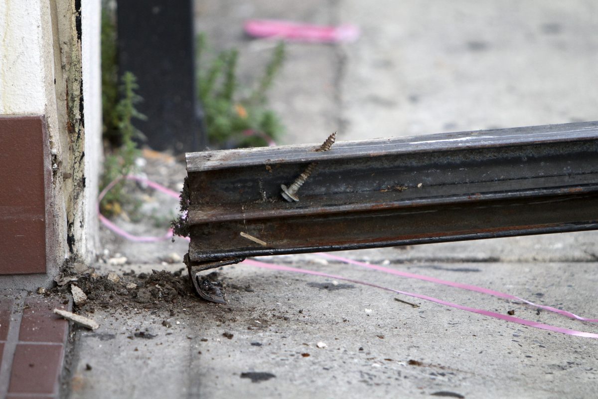 Photos from the scene show the black metal gate lying on the sidewalk, pink balloons still tied to it in front of the shop’s red and white striped awning. Several popped balloons appear trapped underneath the gate, which businesses typically roll down after hours to prevent crime.