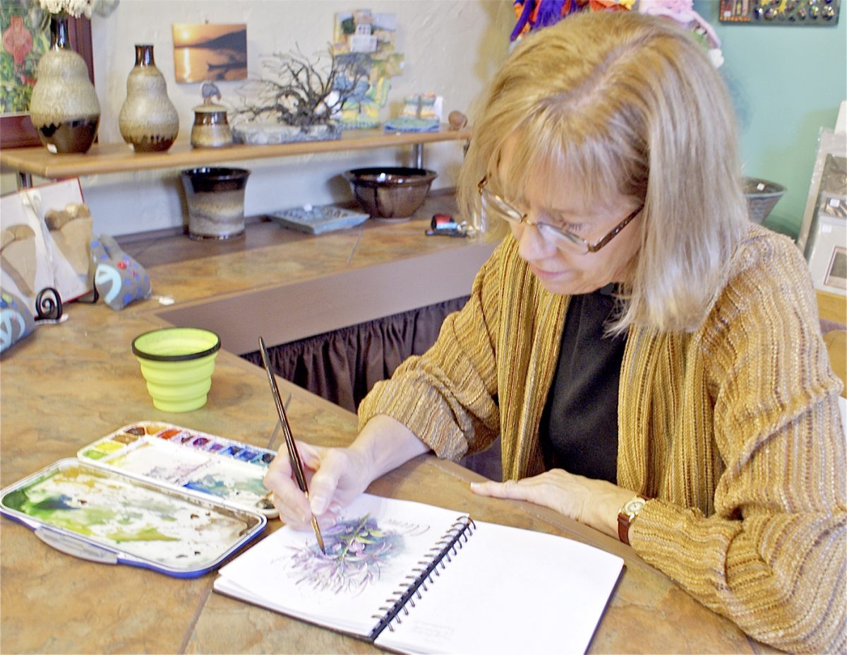 Her watercolor sketches of her trip to Tuscany last summer has led to her being invited there this summer to teach a class. Her choice of Stillman and Birns sketchbooks along with the good work she does made her a featured artist for the company at trade shows. Two of her favorite sized sketchbooks – the 5-1/2-inch by 8-1/2-inch Beta and 7-inch by 7-inch Zeta will be for sale at the opening.