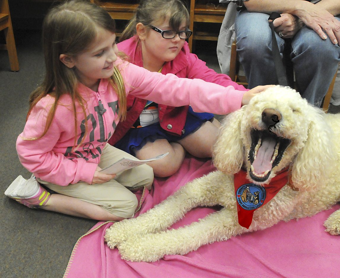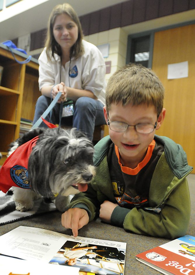 Zeno was one of five certified therapy dogs brought to the Canton Township school for a reading program called “Tail Waggin’ Tutors.” The program, offered through Therapy Dogs International, encourages children to read books of their choosing to the dogs.