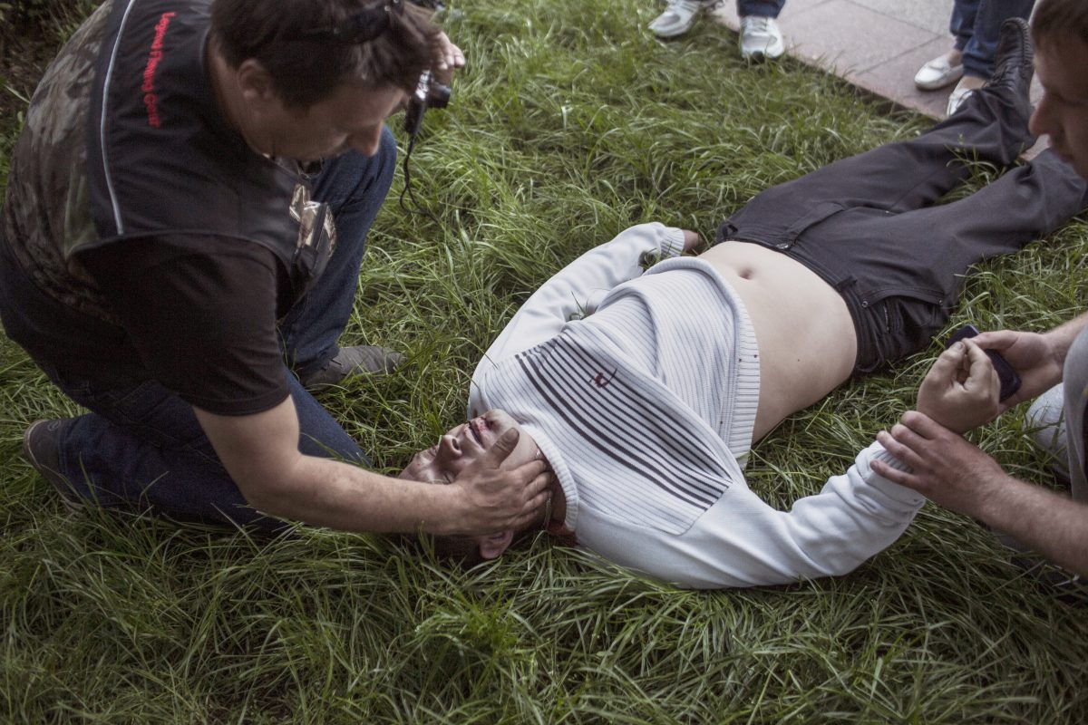Several hours earlier, the men came to the town about 20 miles from the regional capital, Donetsk, and dispersed referendum voting that was taking place outside the town hall and they took control of the building. In the evening, more arrived in a van and a scuffle broke out with people who were gathered around the building. Then they fired shots.