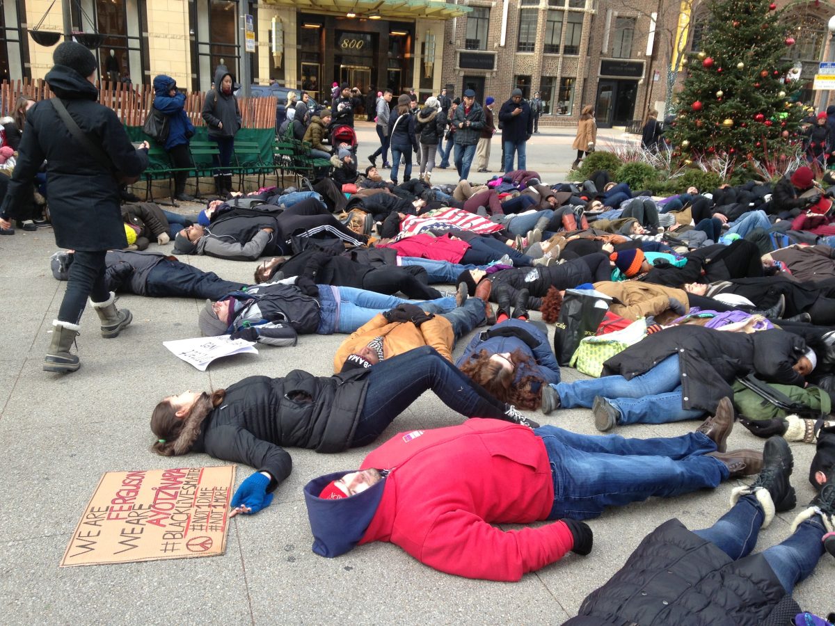 In Chicago, about 200 people gathered near the city’s popular Magnificent Mile shopping district, where Kristiana Colon, 28, called Friday “a day of awareness and engagement.” She’s a member of the Let Us Breathe Collective, which was taking supplies such as gas masks to protesters in Ferguson.