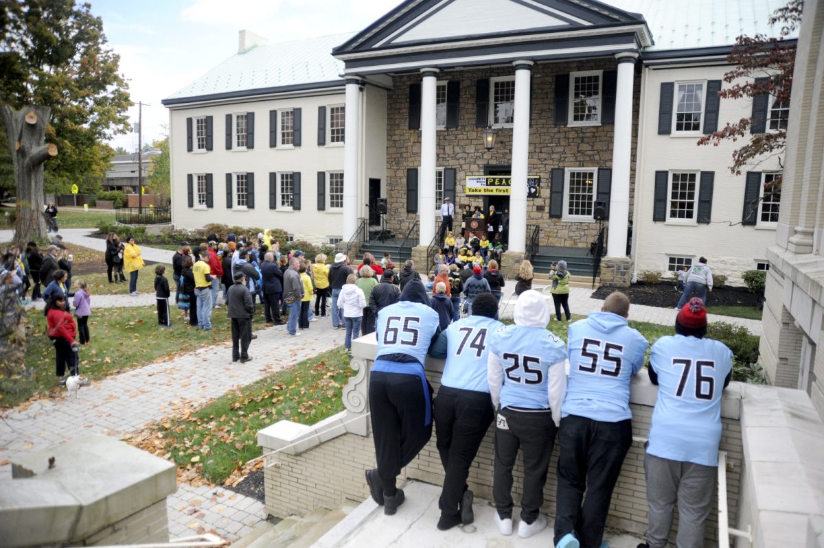 Members of the Washington High School football team and other community members listen as local officals speak at the third annual “March for Peace” event at McMillan Hall on Washington & Jefferson College’s campus. After several speakers, the group walked about a mile for the march, which was put on by CommUNITY.