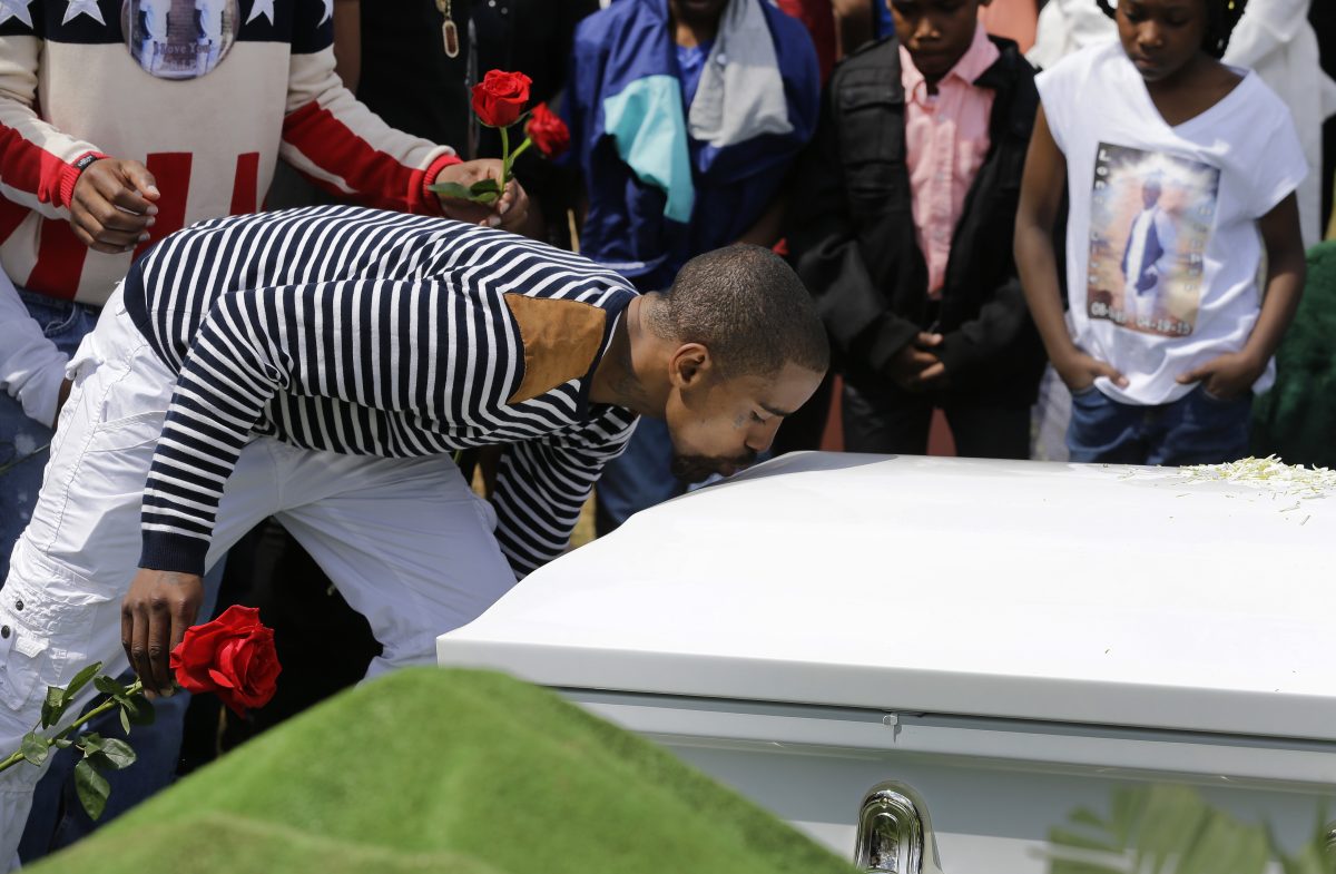 A small group of mourners started lining up about two hours ahead of Monday’s funeral. Placed atop Gray’s body was a white pillow with a screened picture of him. A projector aimed at two screens on the walls showed the words “Black Lives Matter & All Lives Matter.”
