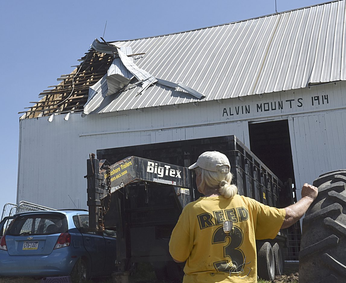 Elizabeth McCord of 790 Jolly School Road in South Franklin Township surveys damage to her barn roof Tuesday after a storm ripped through the area Monday evening, uprooting trees and downing power lines. Sixteen trees on the McCord property were downed.