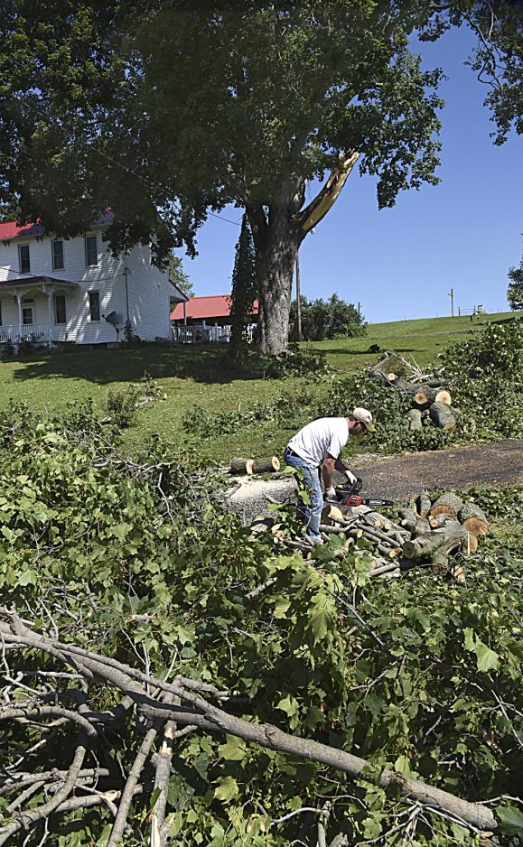Shawn Speer of 962 Jolly School Road in South Franklin township chain saws through part of a 50-foot section of a downed oak tree that blocked his driveway and landed partly on the roof of his barn during the storm Monday evening.