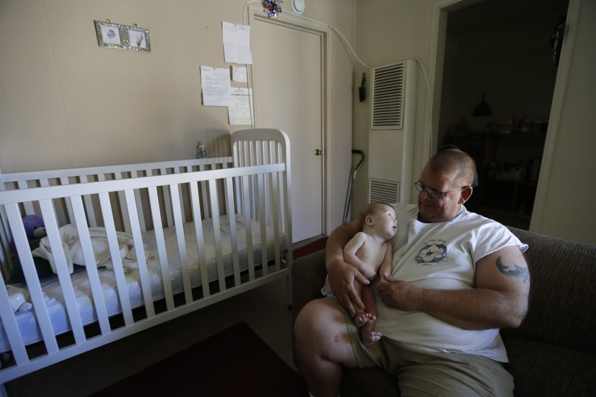 Veteran Arthur Lute holds his is 5-month-old son Evan in his one-bedroom apartment in Chula Vista, Calif. Lute’s arduous journey from his days as a U.S. Marine to his nights sleeping on the streets illustrates the challenge the Obama administration faces to make good on its audacious promise: End homelessness among veterans by 2015. (AP Photo/Gregory Bull)